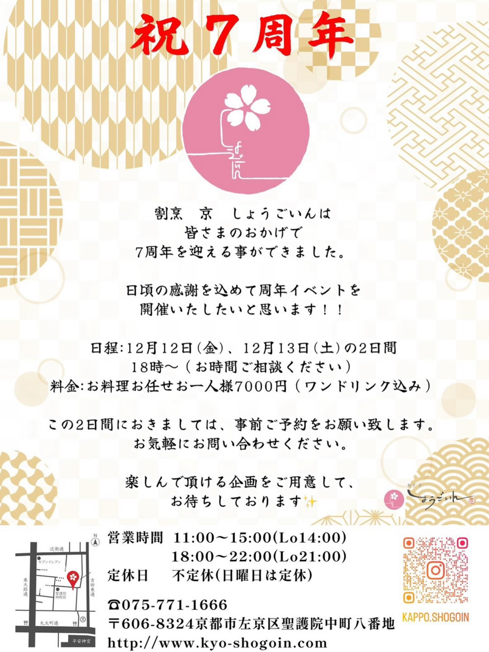 割烹京しょうごいんは来月12月13日で 7周年を迎えます!